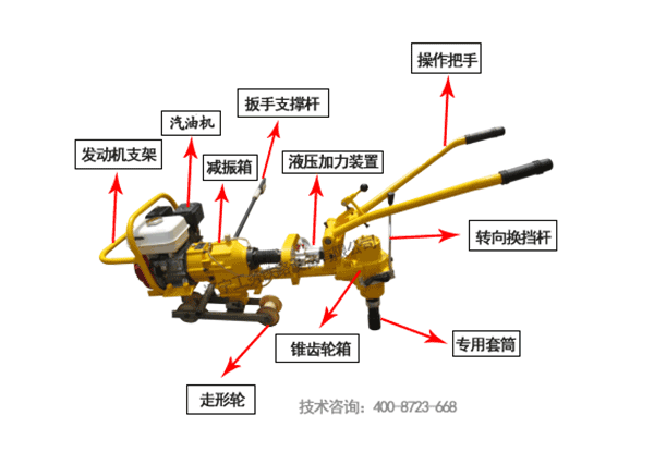 5.操作手柄的無(wú)縫鋼管形成焊接結(jié)構(gòu)。壓下操作手柄可以使套筒與軌枕扣件螺母對(duì)齊,同時(shí)結(jié)合減速機(jī)內(nèi)的錐形摩擦離合器來(lái)擰緊或松開(kāi)螺母。也可以在道路上上下下和舉升機(jī)器時(shí)使用。